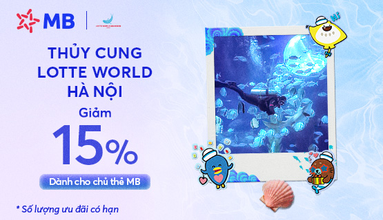 - Giảm 15% tối đa 100.000 VND khi thanh toán phí vé Thủy Cung Lotte World Hà Nội bằng thẻ MB với hóa đơn từ 500.000 VND.